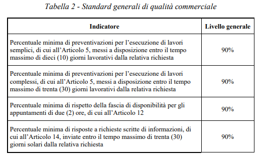 Art. 20.1 → In caso di mancato rispetto degli standard specifici di qualità definiti all’Articolo 18, l’esercente corrisponde all’utente, in occasione del primo documento di fatturazione utile, un indennizzo automatico base pari a: