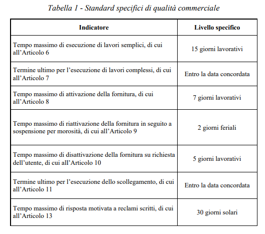 art. 24.1 → In caso di mancato rispetto degli standard specifici di qualità definiti all’Articolo 20, l’esercente corrisponde all’utente, in occasione della prima bolletta utile, un indennizzo automatico base pari a: